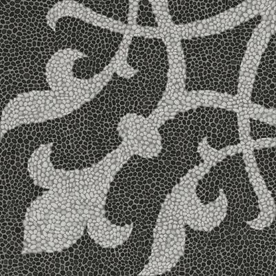Крупный орнамент с элементами флер-де-лис — геральдической лилии — воспроизведен в технике каменной мозаики. Создать легкий рельеф на поверхности керамического гранита позволило сухое декорирование Dry Fix. Элементы рисунка стыкуются между собой, позволяя продолжать узор в любом направлении. Продукт устойчив к глубокому истиранию и может быть использован даже в общественном пространстве с интенсивным трафиком.