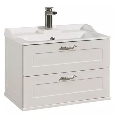 Мебель в пленке с фактурой под натуральное дерево, а раковина, изготовленная из литого мрамора, имеет изящные формы,пристенные бортики и площадки.