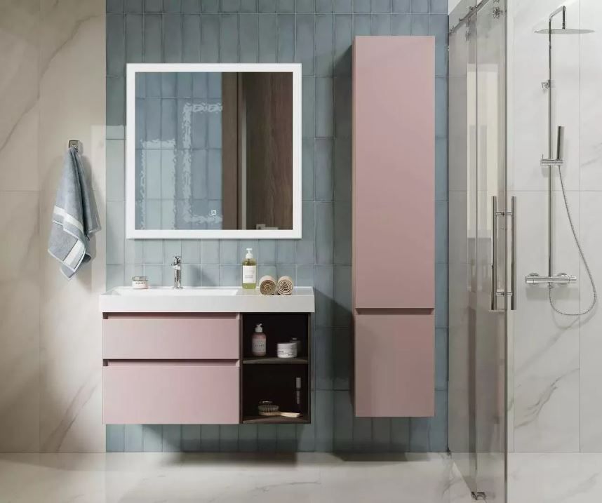 Тумба подвесная CUBO 90 см левая, цвет мальва матовый-структурный орех