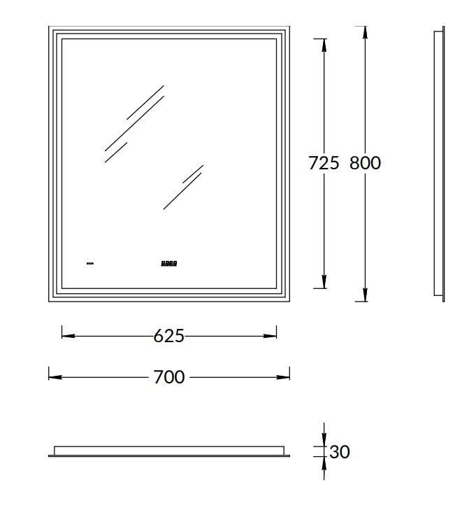 Зеркало Tecno 70х80 см с с LED-подсветкой: антизапотевание, диммер, часы